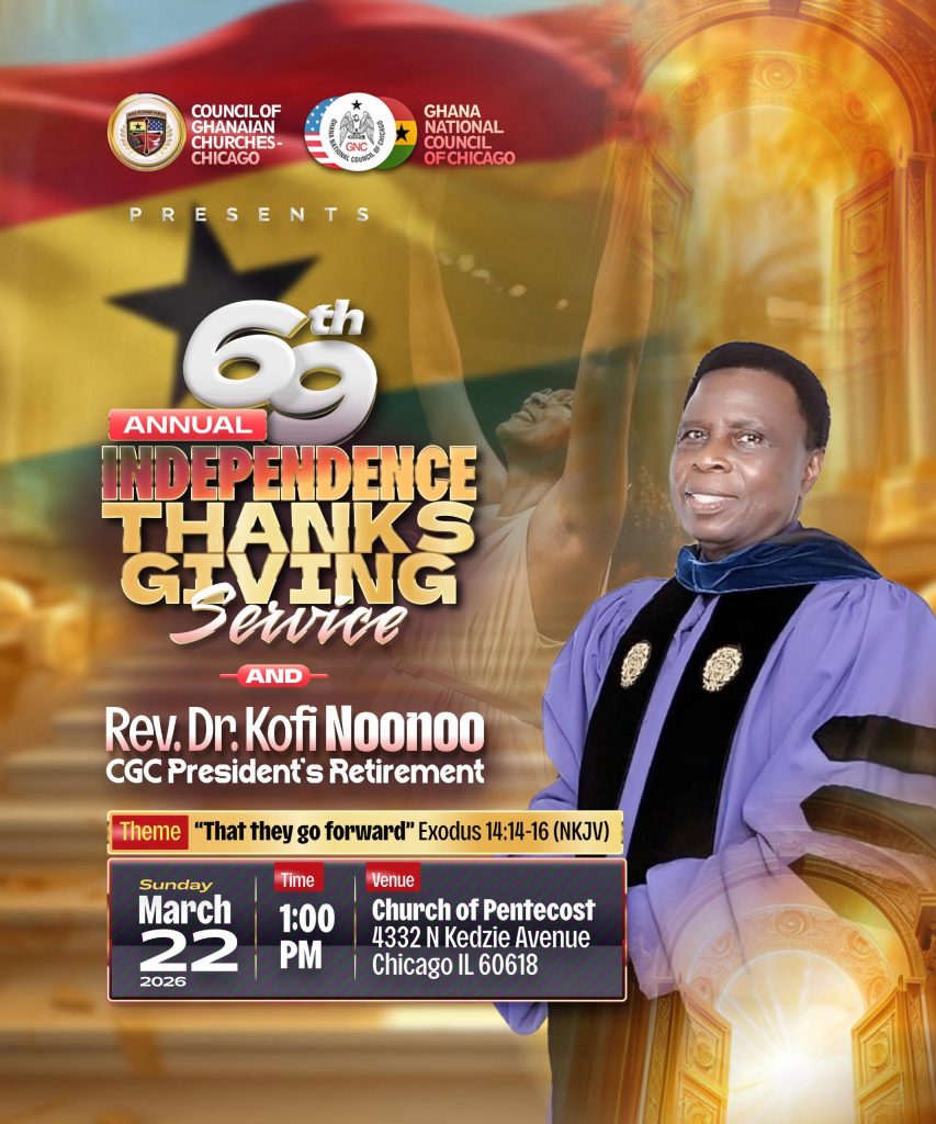 The Ghanaian community in Chicago is preparing for a moment of deep gratitude and collective reflection as the Council of Ghanaian Churches , Chicago, announces a historic celebration in honor of Rev. Dr. Kofi Noonoo. After three decades of steady, compassionate, and visionary leadership as President of the Council, Rev. Dr. Noonoo will be recognized upon his retirement during the 69th Annual Ghana Independence Thanksgiving Service.