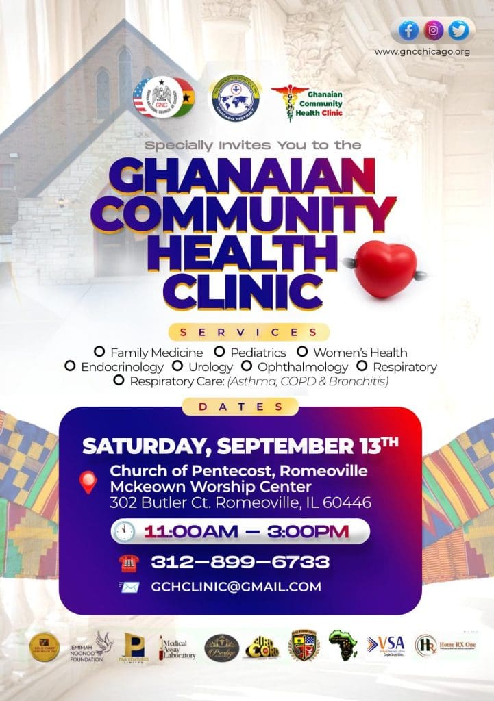 ROMEOVILLE, IL — In a city where access to healthcare can often feel distant or delayed, the Ghana National Council of Metropolitan Chicago is offering something rare: consistency, compassion, and community-driven care. Under the auspices of the Ghanaian Community Clinic, the Council will host its monthly health clinic this Saturday, September 13th, at the Church of Pentecost — McKeown Worship Center, located at 302 Butler Court.