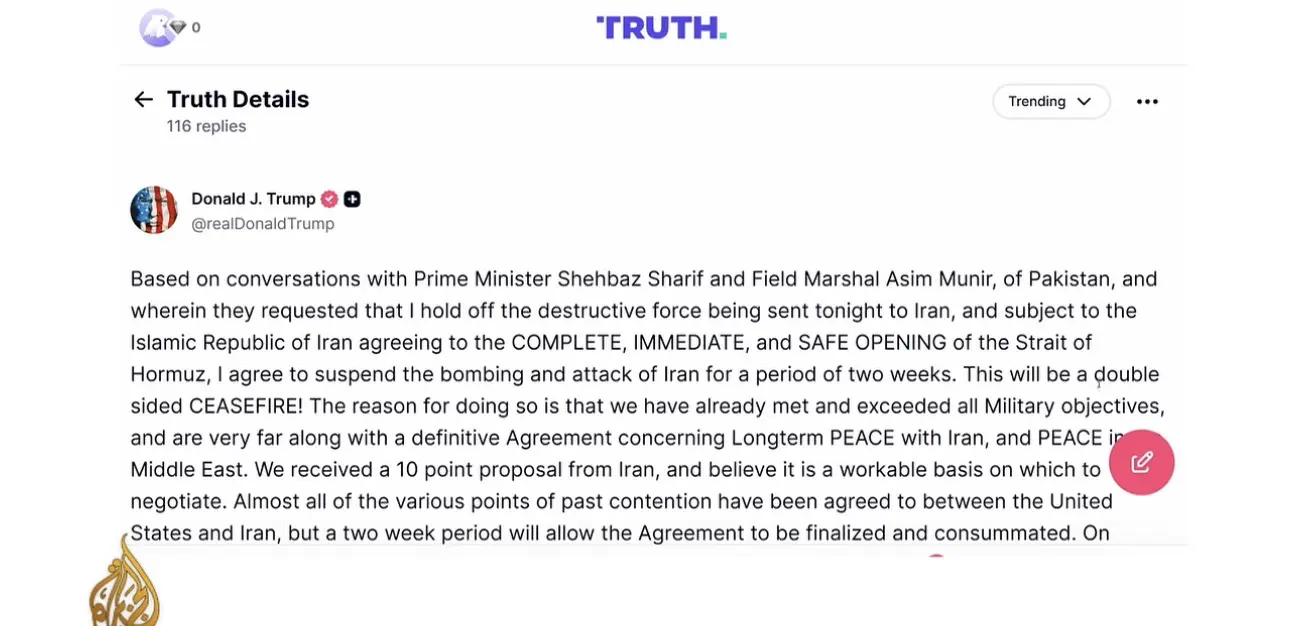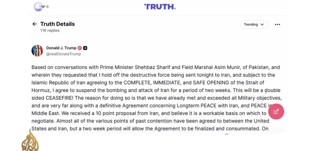 Trump revealed that the United States has received a 10‑point proposal from Iran, which he characterized as a “workable basis” for continued negotiations. He said that most major points of contention between Washington and Tehran had been addressed, and that the two‑week window would allow time for a final agreement to be completed.