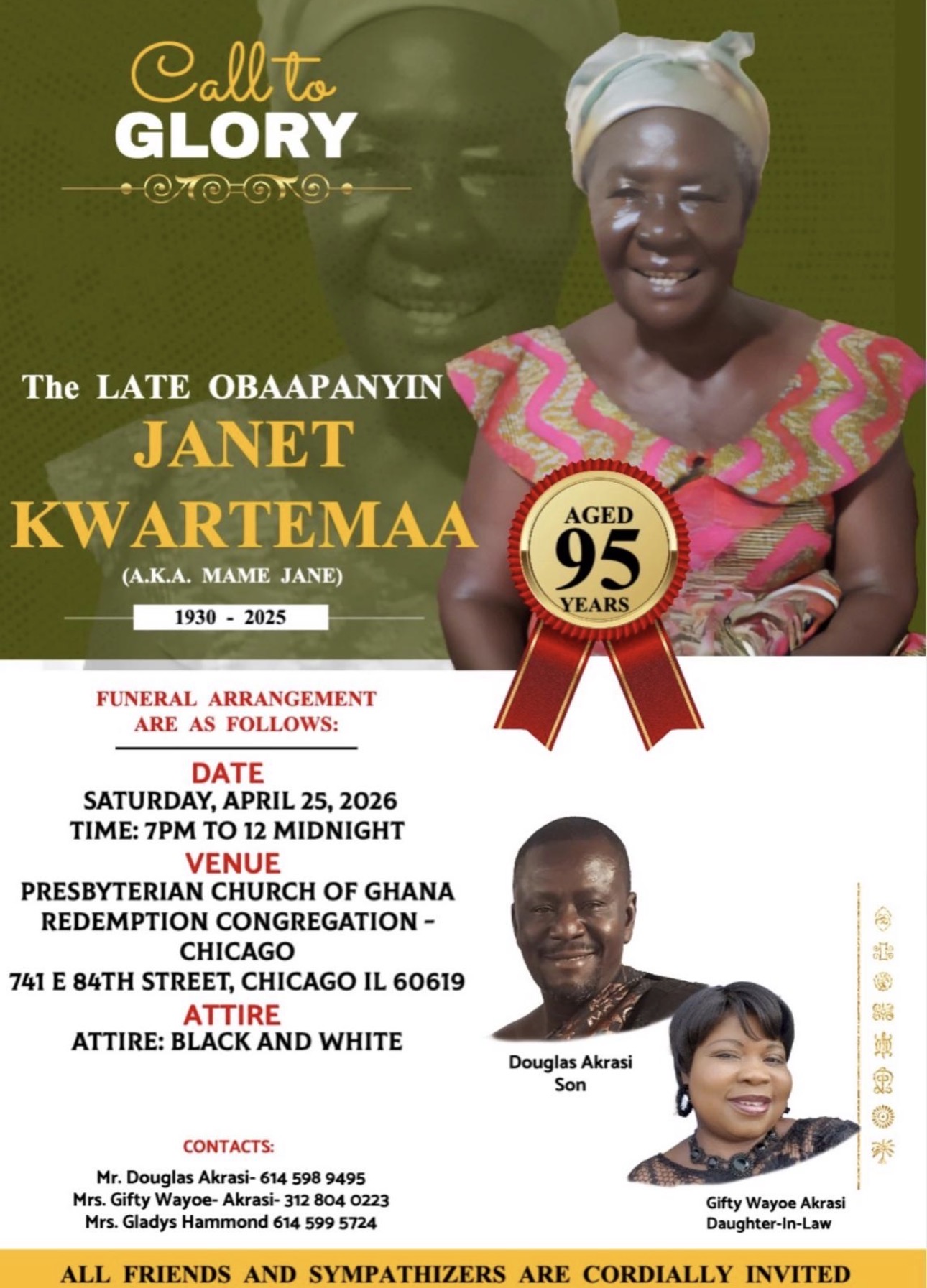 The Redemption Congregation of the Presbyterian Church of Ghana in Chicago was transformed into a sanctuary of reverence and radiant gratitude on April 25, 2025, as the Ghanaian community gathered to celebrate the extraordinary life of Obaapanin Janet Kwartemaa, who completed her earthly journey at 95.