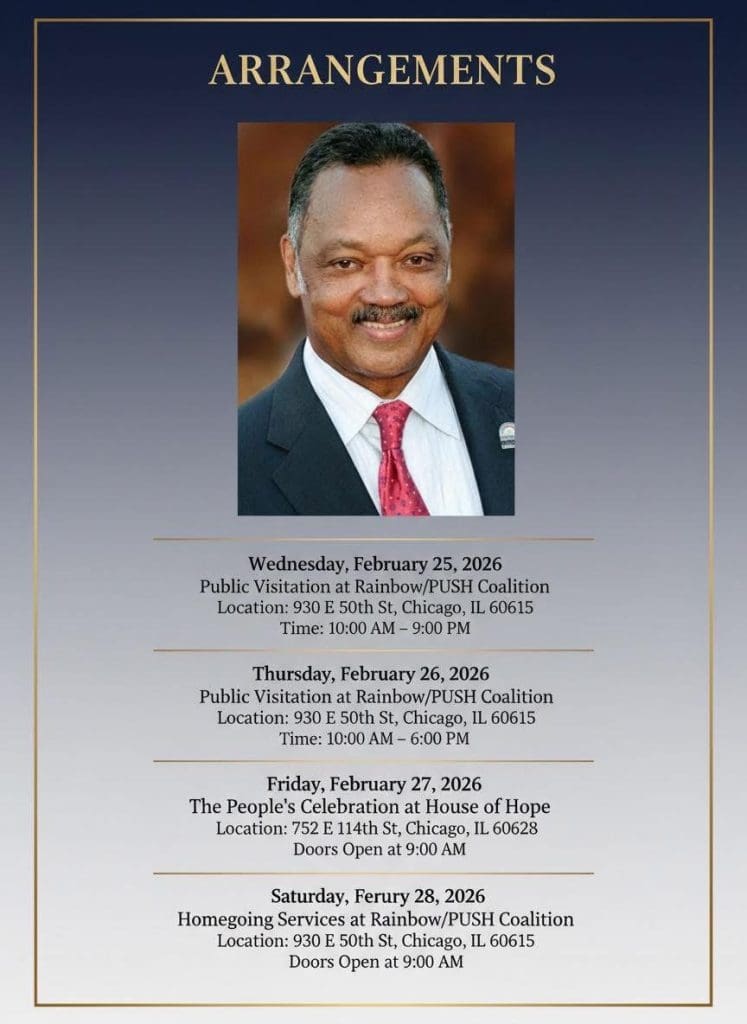 Public visitations will begin on Wednesday, February 25, 2026, at the Rainbow/PUSH Coalition headquarters at 930 E 50th Street in Chicago. The first day’s visitation will run from 10:00 a.m. to 9:00 p.m., followed by a second visitation on Thursday, February 26, from 10:00 a.m. to 6:00 p.m.