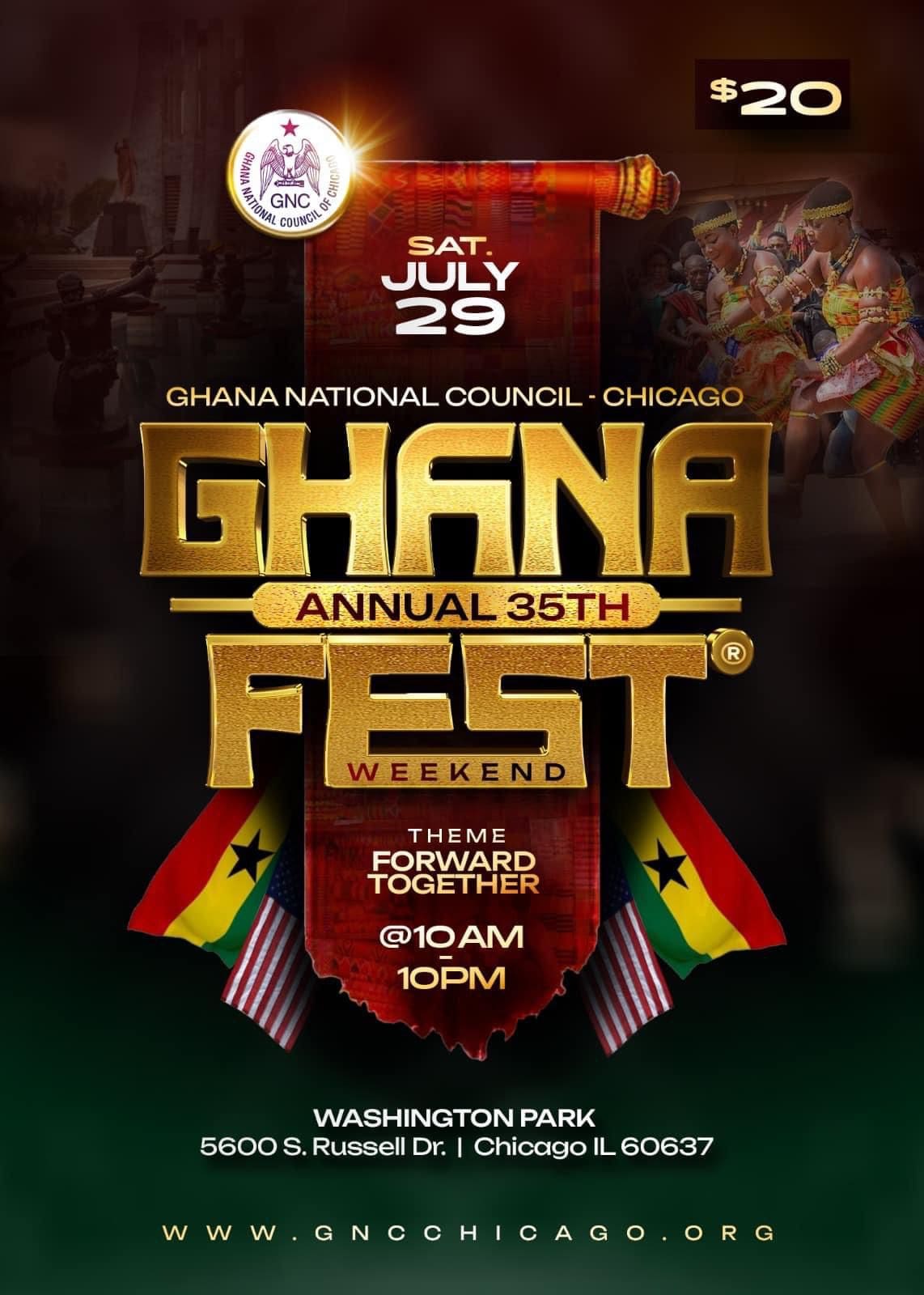 Ghana National Council of Chicago and its Affiliates are excited to bring to Chicagoland our most anticipated cultural flagship event, the 35th Annual GhanaFest®️. The theme is -“Forward Together”!