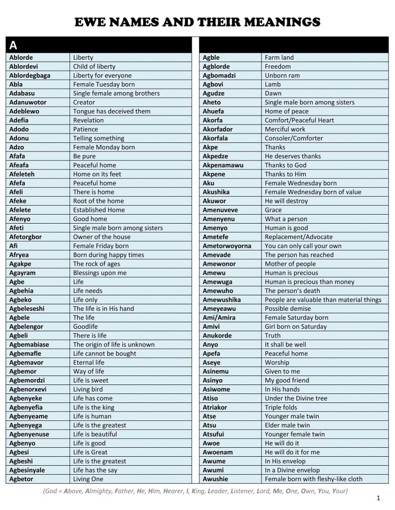 A detailed chart of Ewe names beginning with the letter “A” and their English meanings, celebrating culture, faith and identity.