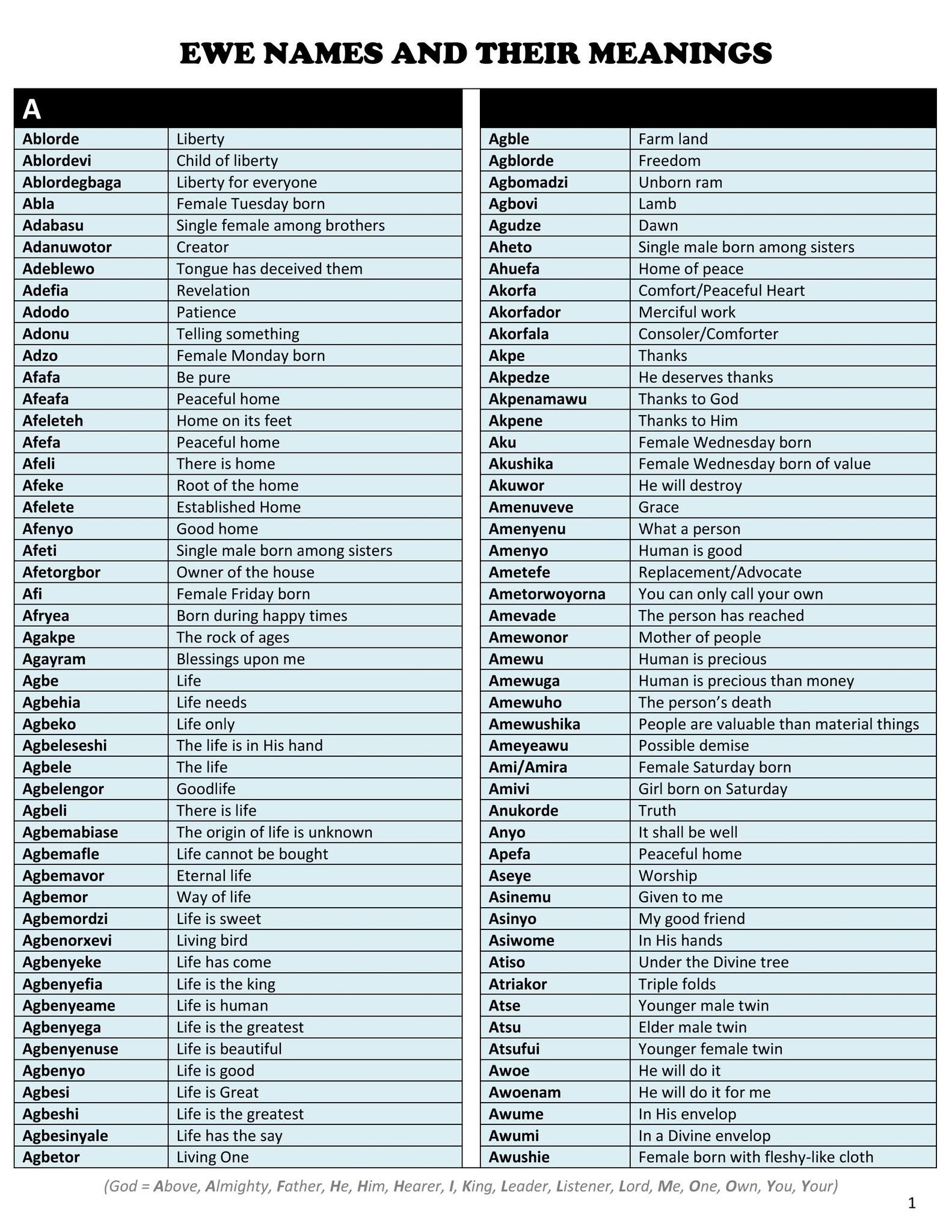 Chart of Ewe names and their meanings