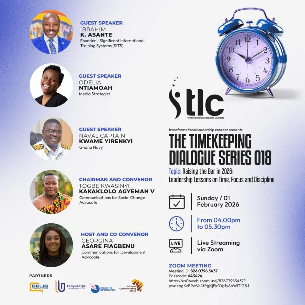 Accra, Ghana – February 9, 2026 As the nation prepares to celebrate its 69th independence anniversary in 2026, there is a call for a shift from conversation to action and a renewed national culture of discipline, accountability and respect for time. This call was made during Episode 18 of the Transformational Leadership Concepts’ Timekeeping Dialogue Series.