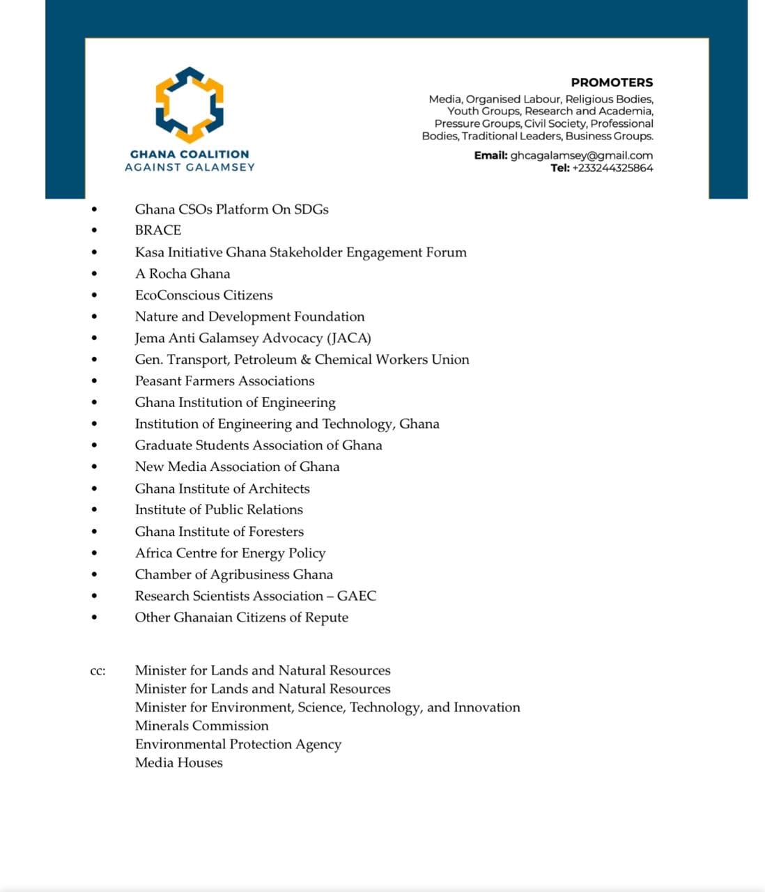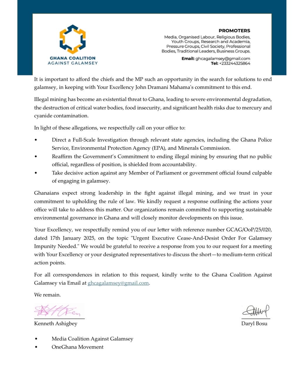 The issue of galamsey has become an existential threat to Ghana, with severe environmental degradation, destruction of critical water bodies, food insecurity, and significant health risks due to mercury and cyanide contamination. The coalition is demanding that the government takes decisive action against any public official found culpable of engaging in galamsey.