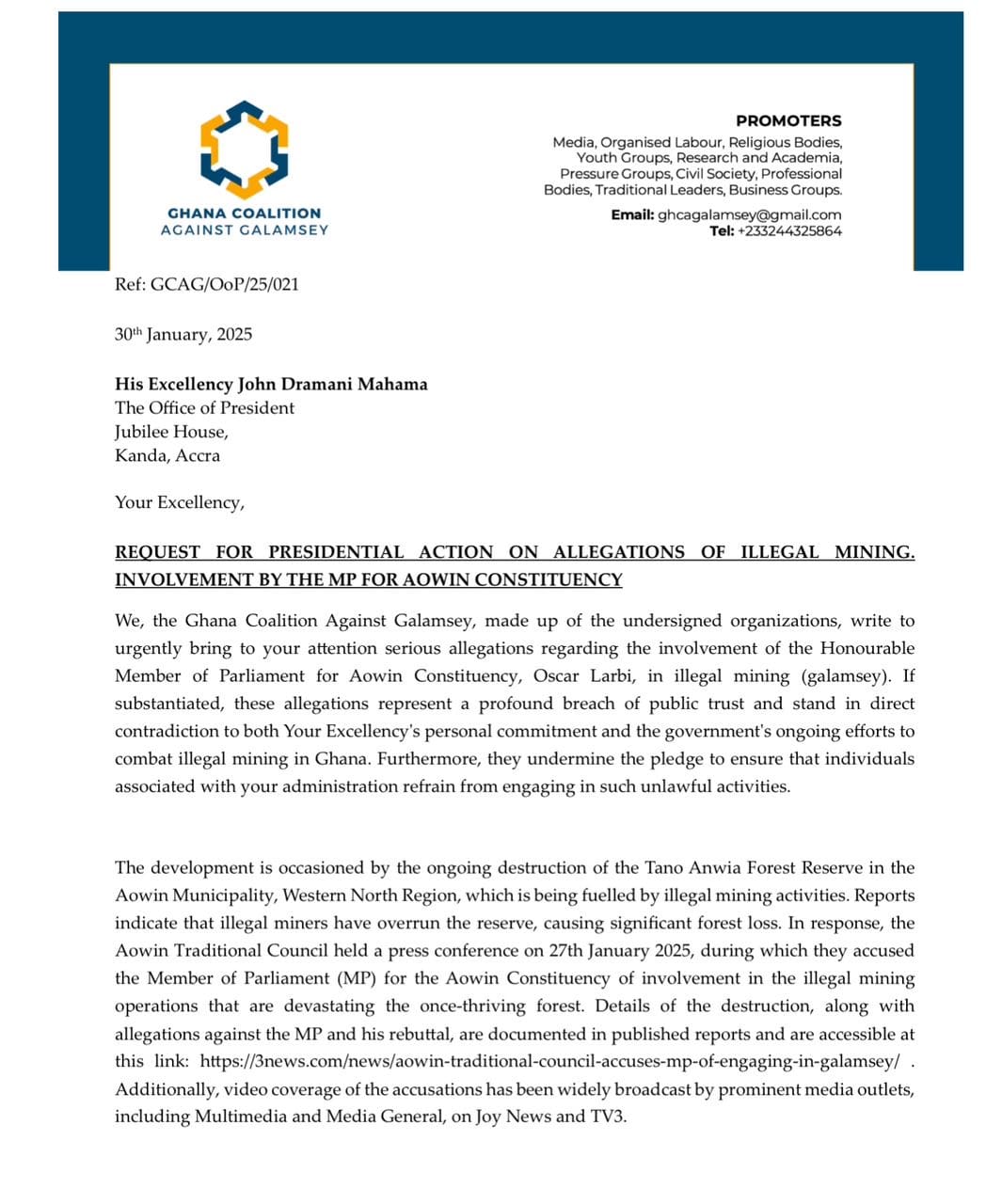 The Ghana Coalition Against Galamsey has urged President John Dramani Mahama to take immediate action against the Member of Parliament for Aowin Constituency, Oscar Larbi, over allegations of his involvement in illegal mining activities. The coalition’s request comes amidst the devastating destruction of the Tano Anwia Forest Reserve in the Aowin Municipality, Western North Region, where illegal miners have overrun the reserve, causing significant forest loss.