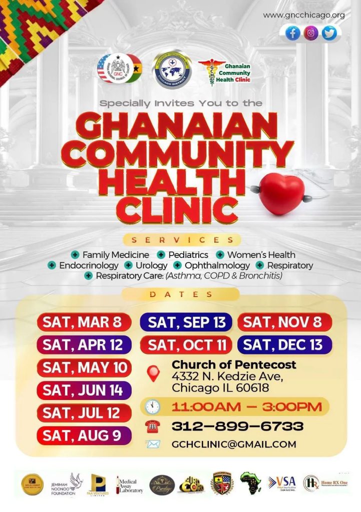 Chicago — After a brief one-month pause, the Ghanaian Community Health Clinic (GCHC) is back, reaffirming its mission to provide free, quality healthcare to the Ghanaian and broader African diaspora in Chicago. The clinic will hold its final session of the year on Saturday, December 13, 2025, from 11:00 a.m. to 3:00 p.m. at the Church of Pentecost, 4332 N. Kedzie Avenue.
