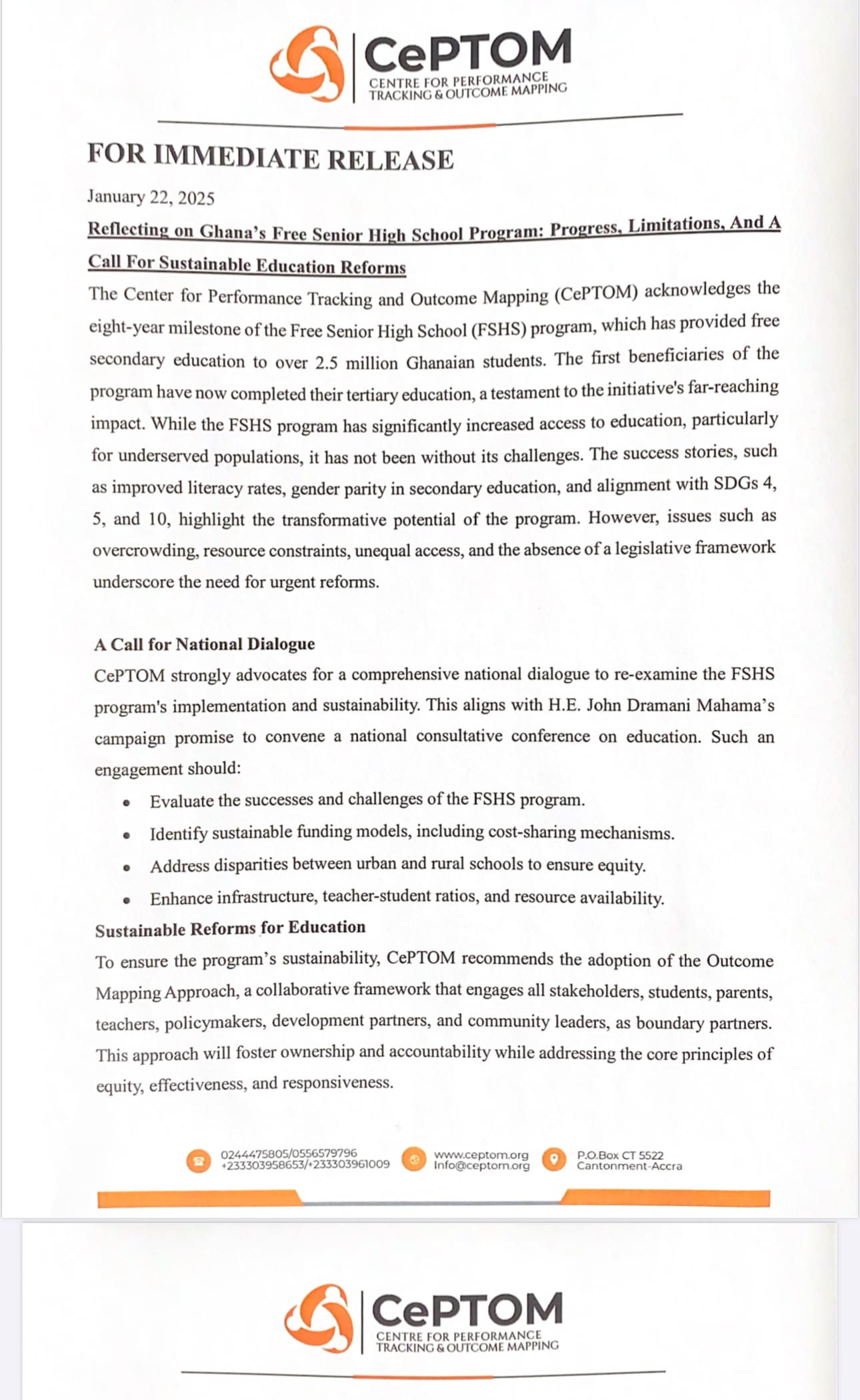 To address the program’s challenges, the Center for Performance Tracking and Outcome Mapping (CePTOM) is advocating for a comprehensive national dialogue to re-examine the FSHS program’s implementation and sustainability. This dialogue should focus on evaluating the program’s successes and challenges, identifying sustainable funding models, addressing disparities between urban and rural schools, and enhancing infrastructure, teacher-student ratios, and resource availability.