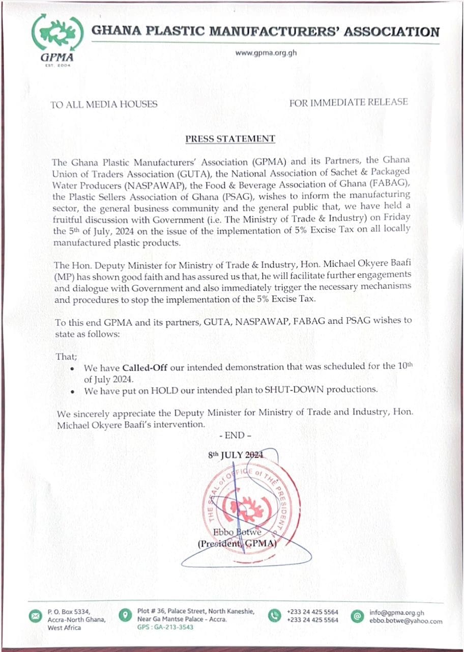 In a dramatic turn of events, the Ghana Plastic Manufacturers’ Association (GPMA) and its partners have called off their planned demonstration and shutdown of production, scheduled for July 10, 2024. This decision comes after a fruitful discussion with the Ministry of Trade and Industry on July 5, 2024.