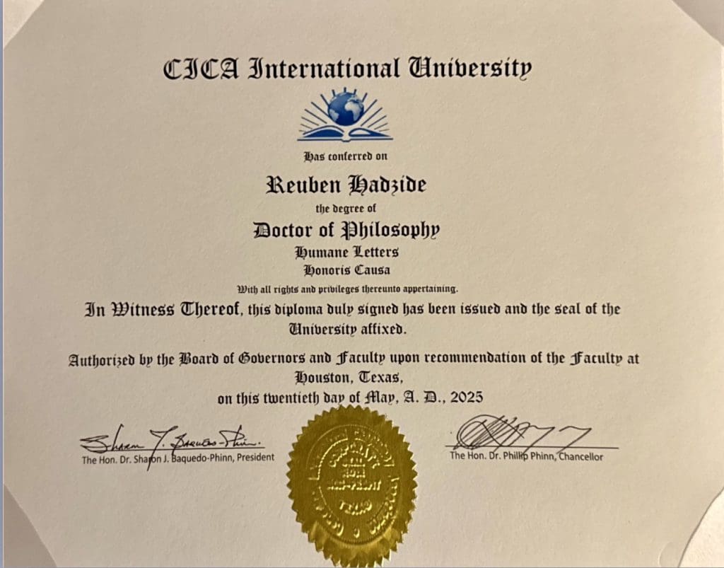 In a momentous recognition of his unwavering dedication to humanity, Reuben Cudjoe Hadzide, a distinguished media personality, has been awarded an Honorary Doctoral Degree in Human Letters-Honoris Causa by CICA-International University & Seminary. This prestigious honor celebrates his profound impact on society through his work in media, philanthropy, and community service.