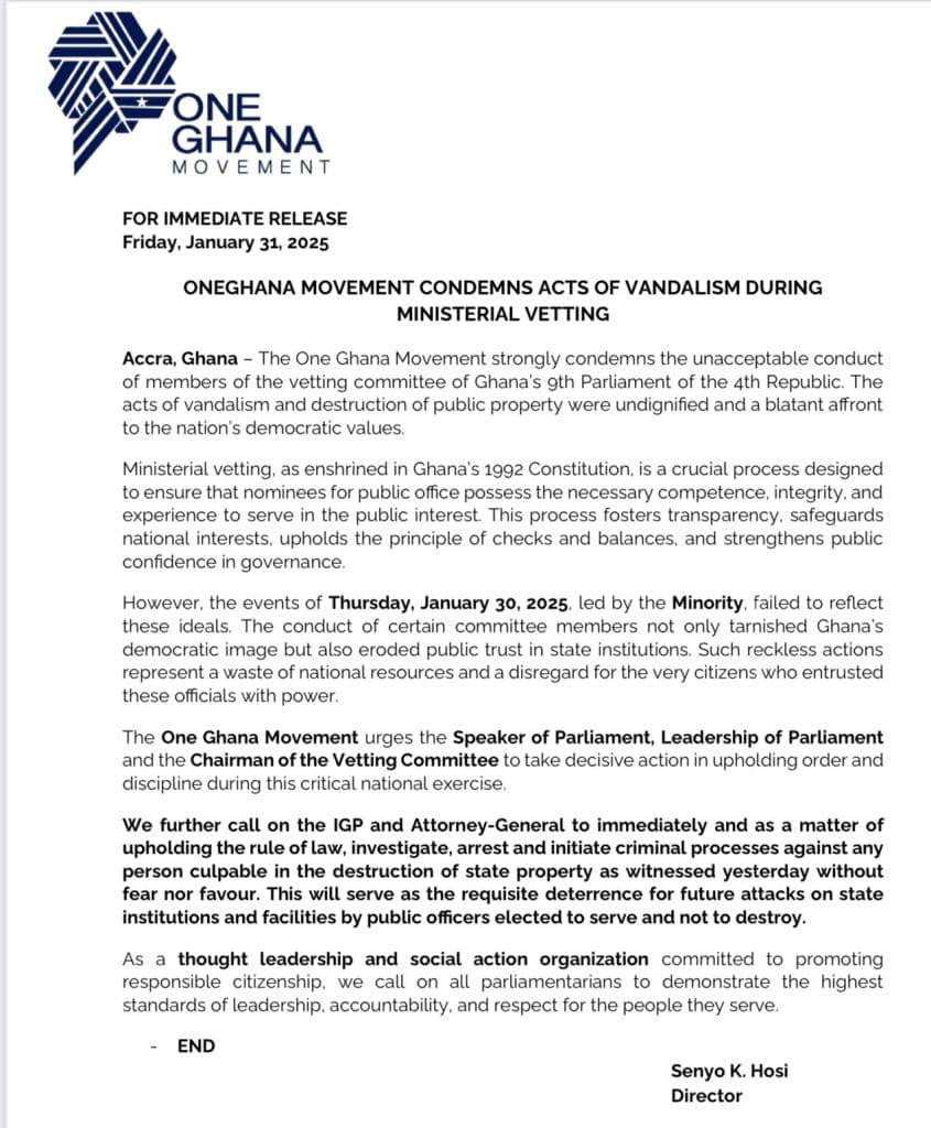 The One Ghana Movement calls on the Speaker of Parliament, the Leadership of Parliament, and the Chairman of the Vetting Committee to take decisive action to maintain order and discipline during this critical national exercise. They also urge the Attorney-General to investigate, arrest, and prosecute those responsible for the destruction of state property, without fear or favor. This will serve as a deterrent for future attacks on state institutions by public officials who are elected to serve, not destroy.