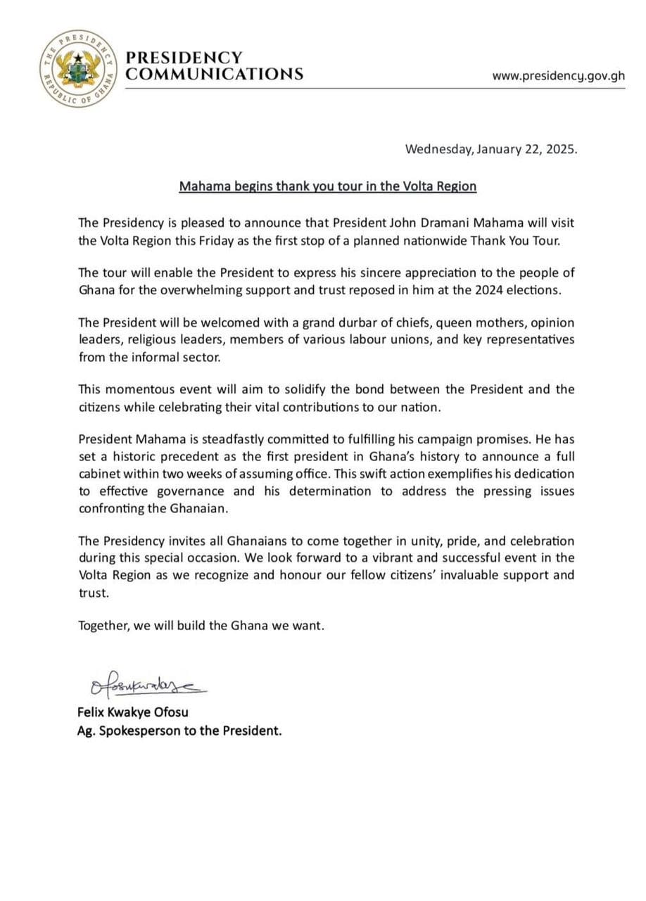This Friday, President John Dramani Mahama will visit the Volta Region, kicking off his nationwide Thank You Tour. The tour is a gesture of appreciation for the overwhelming support Ghanaians showed him during the 2024 elections.