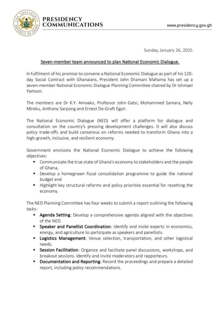 In a move to fulfill his 120-day Social Contract with Ghanaians, President John Dramani Mahama has announced a seven-member National Economic Dialogue Planning Committee. The committee, chaired by renowned economist Dr. Ishmael Yamson, is tasked with organizing the National Economic Dialogue (NED), a platform for discussing Ghana’s development challenges and building consensus on reforms.