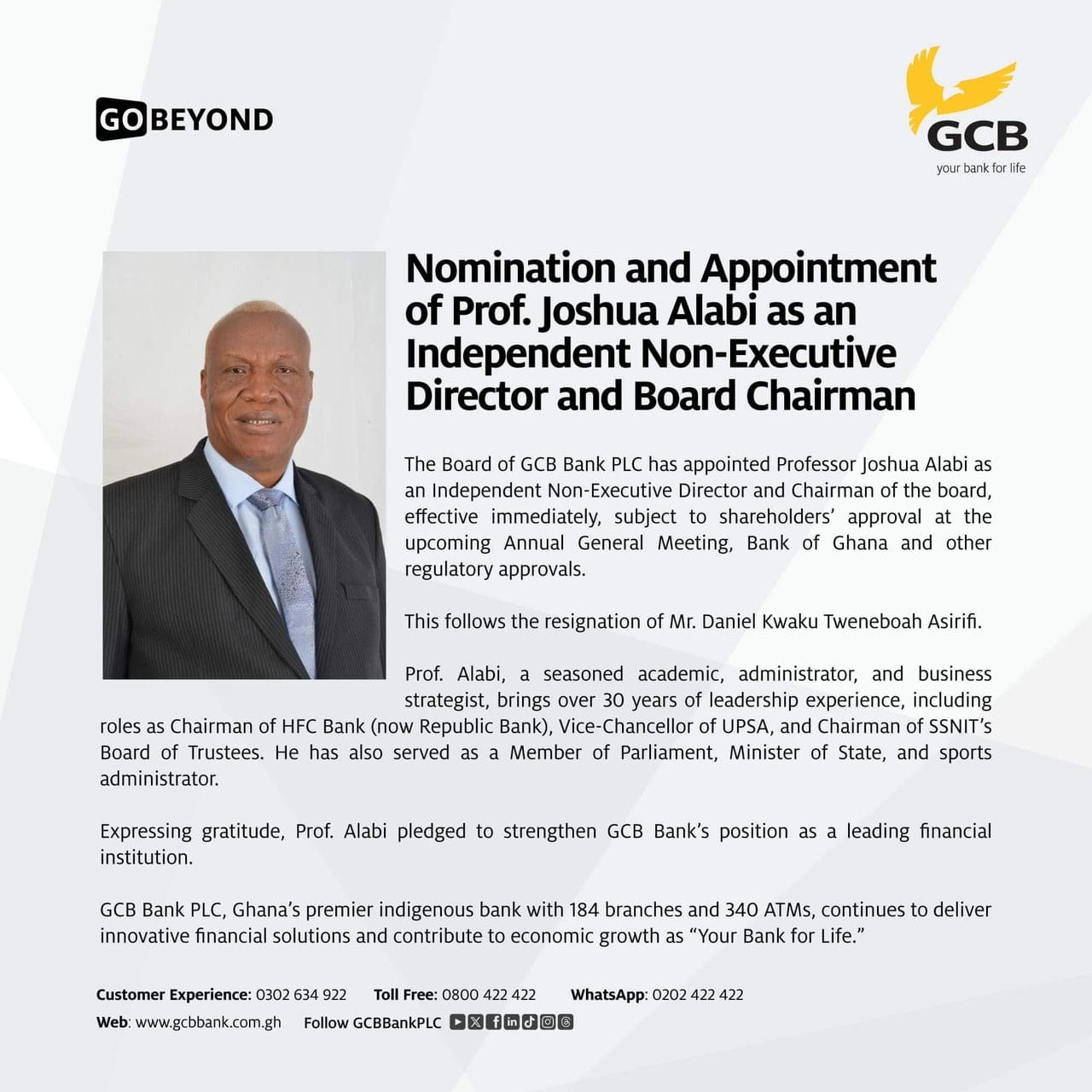 In a move set to bolster GCB Bank PLC’s position as a leading financial institution in Ghana, Professor Joshua Alabi has been appointed as an Independent Non-Executive Director and Chairman of the board. This development follows the resignation of Mr. Daniel Kwaku Tweneboah Asirifi.