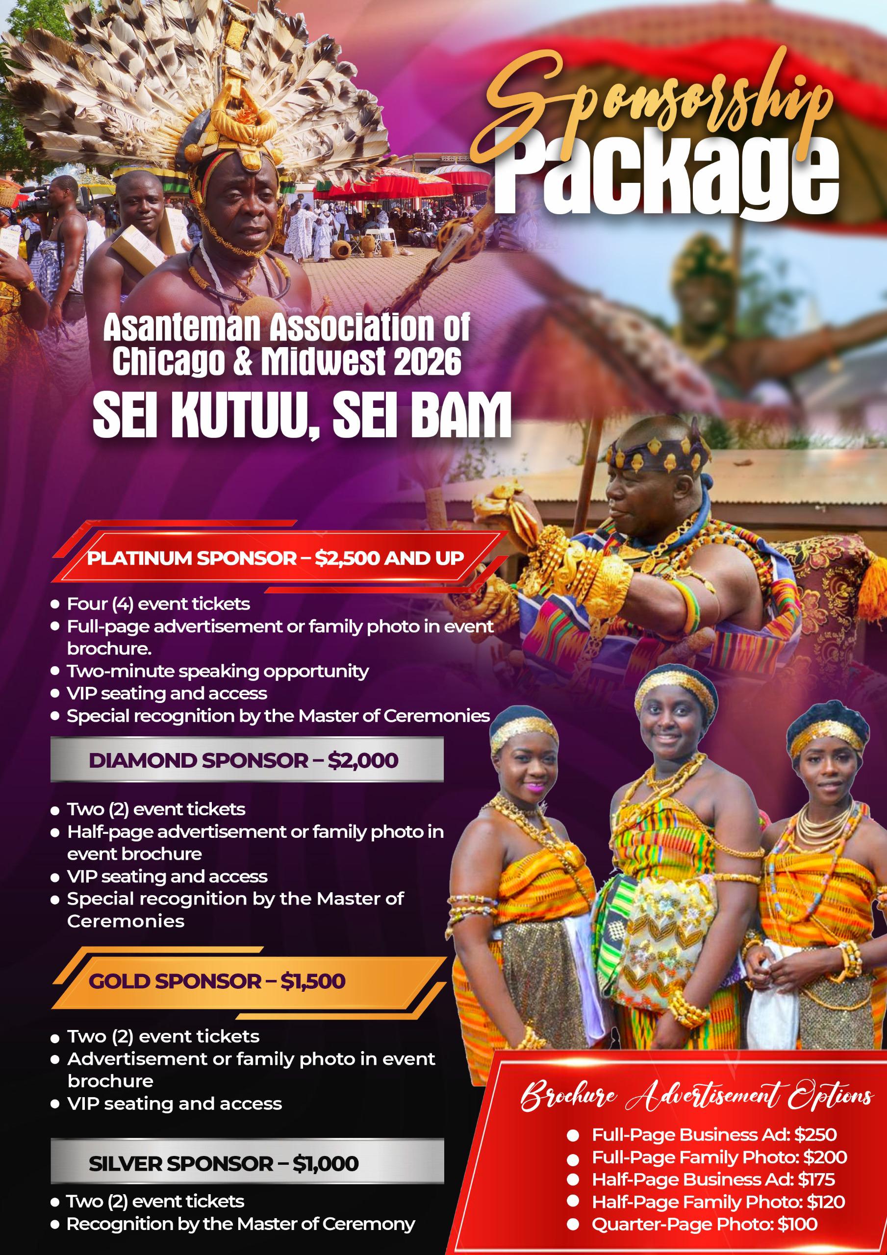 To learn more about sponsorship opportunities or to support this year’s celebration, the Asanteman Association of Chicago & Midwest welcomes your partnership. Interested sponsors may contact Mary Sogbe at 773‑704‑8556 or Nana Ahenkan at 773‑512‑7013 for details on how to get involved. Contributions may also be sent via Zelle to 224‑334‑6661. Every contribution, no matter the size, helps us build a celebration that honors our ancestors and inspires the generations that follow.